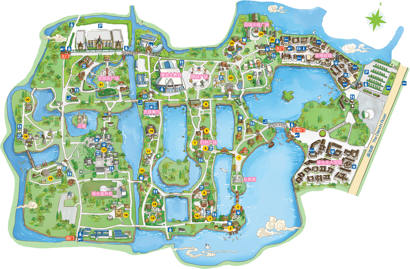 佤族人口約36萬(wàn),主要聚居在云南省瀾滄江南段以西的阿佤山區(qū)。佤族寨位于“翠漪洲”東南角。寨內(nèi)分布有茅草頂?shù)母蓹谑浇ㄖ骸⑴n^廣場(chǎng)、神靈廣場(chǎng)、司崗里石雕以及糧倉(cāng)等。牛頭廣場(chǎng)是佤族古老的剽牛活動(dòng)場(chǎng)所,場(chǎng)正中的牛角為佤族的寨樁,廣場(chǎng)前的兩個(gè)石人分別為佤族的男性和女性祖先。神靈廣場(chǎng)表現(xiàn)了佤族萬(wàn)物有靈、靈魂不死的自然崇拜觀念。場(chǎng)中兩個(gè)石人雕像分別為佤族最崇拜的“木依吉”和“阿依娥”。佤族木鼓舞節(jié)拍鮮明強(qiáng)烈,...
