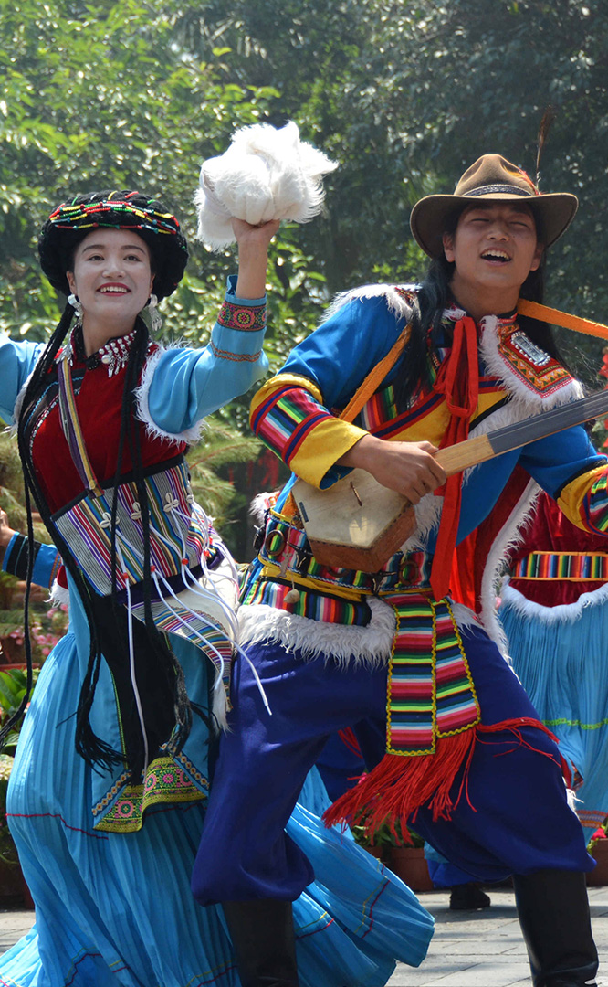 彝族在云南境內(nèi)約471萬(wàn)人,是省內(nèi)人口最多、分布最廣的少數(shù)民族,主要聚居在金沙江、元江流域和哀牢山、無(wú)量山腹地。彝族是一個(gè)能歌善舞的民族,民間打歌、跳樂(lè)之風(fēng)盛行,大三弦、跌腳舞久負(fù)盛名。火把節(jié)是彝族最具特色的民族節(jié)日。彝族村占地50余畝,三虎浮雕墻與虎頭內(nèi)祖師形象表現(xiàn)了彝族虎鷹文化。太陽(yáng)歷廣場(chǎng)圖騰柱上有太陽(yáng)、虎、火和八卦圖形象,周圍環(huán)繞著10個(gè)朝向不同的月球造型,外圓周有12生肖石雕。依山而建的“...
